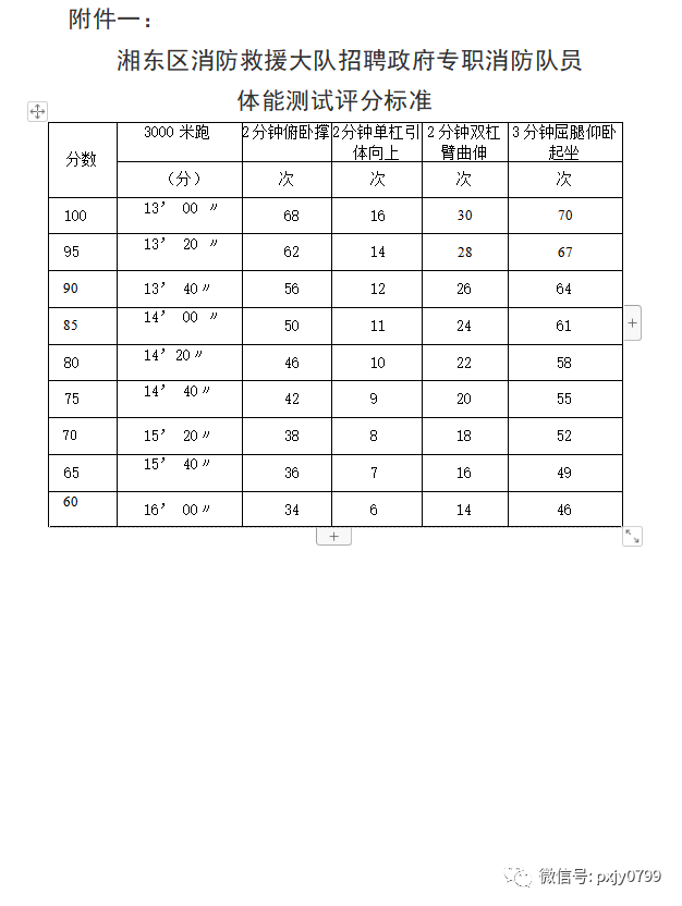 2、考试考试分为:面试、体能测试、笔试三个环节面试,面试测试满分100分,占总成绩20%;体能测试满分为100分,占总成绩40%;笔试满分为100分,占总成绩40%。体能测试项目包括:3000米跑,占体能成绩40%;2分钟俯卧撑占体能成绩20%,屈腿仰卧起坐占体能成绩20%;单杠引体向上、双杠臂曲伸任取一项,占体能成绩20%。(体能测试运动强度较大,存在一定风险,患有高血压,糖尿病,心脏病等疾病,不适合剧烈运动人员请及时向监考组说明)。四项(标准参照《江西省合同制消防员招聘管理暂行办法》)笔试内容包括:灭火救援基础理论、消防装备技术、国家综合性消防救援队伍基础知识;